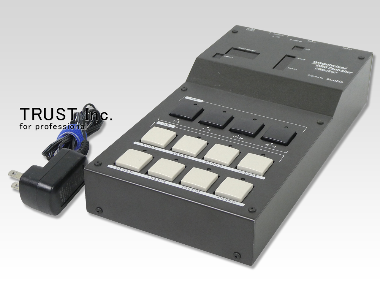 DSB-32/U7 は、舞台照明やDMX制御機器の DMXコントローラ/スイッチボックス です。パソコン上で作成したショーデータ(シーンシーケンスデータ)を本体に転送し、最大32シーン(プリセット)をボタン操作で呼び出して DMX信号を出力できる装置として使われます。