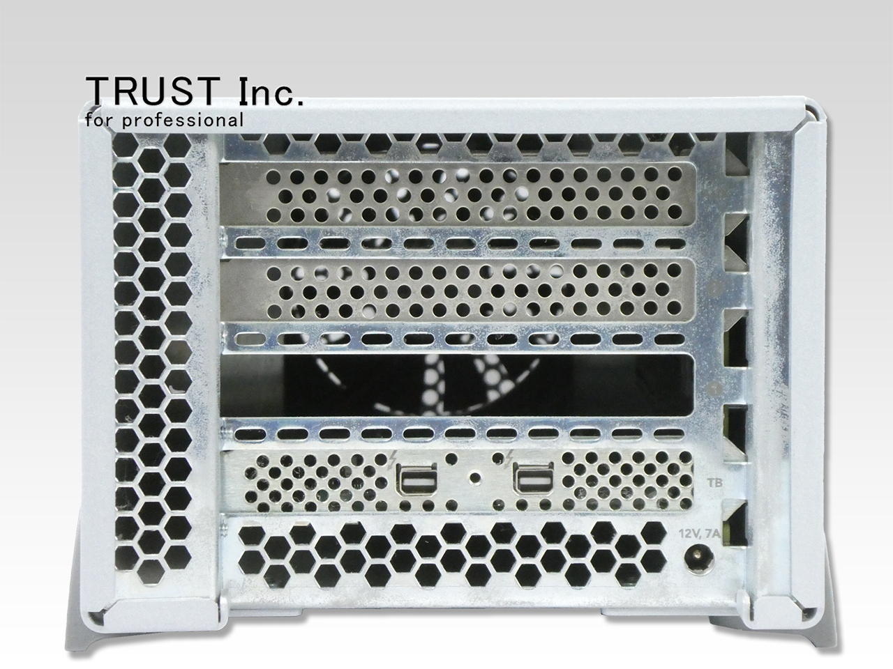 コンピュータの Thunderbolt ポートから PCIe カードを外付けできる拡張シャーシ(エンクロージャ) です。PCIe スロットを持たない薄型ノートPCや小型デスクトップでも、プロ用途の PCIe 拡張カードを利用可能にします。